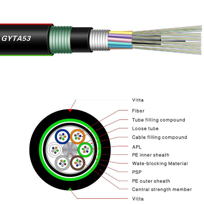 زره پوش زیرزمینیGYTA53 لوله شل مستقیم دفن شده در فضای باز 4 6 8 12 16 18 24 36 48 72 96 144 288 کابل فیبر نوری هسته