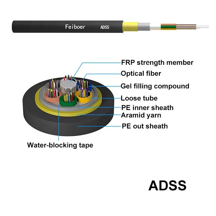 کابل ADSS ساختار رشته ای لوله سست است.فیبر نوری 250 میکرومتر است ، لوله سست از پلاستیک با مدول بالا ساخته شده است که با ترکیب ضد آب پر شده است.در مرکز هسته کابل یک عضو استحکام FRP قرار دارد ، لوله سست (و طناب پر کننده) به دور هسته تقویت کننده مرکزی پیچ خورده است تا یک هسته کابل فشرده و گرد تشکیل شود و شکاف هسته کابل با آب پر می شود پرکننده مسدود کنندهقسمت بیرونی کابل یک غلاف داخلی پلی اتیلن (PE) است ، سپس با مقاومت کششی بالا آرامید پیچ خورده است ، بیرونی ترین غلاف خارجی ردیابی الکتریکی (AT) است.